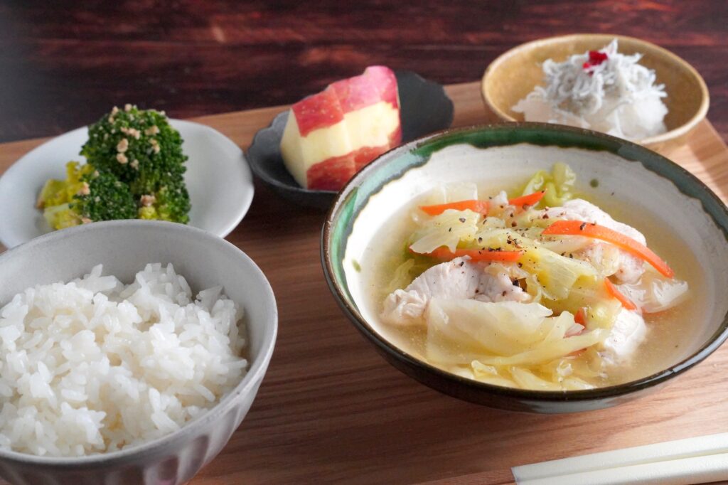 ささみ入りキャベツスープ献立|胃腸に優しい消化の良いあっさり晩ごはん(#79_1日目)