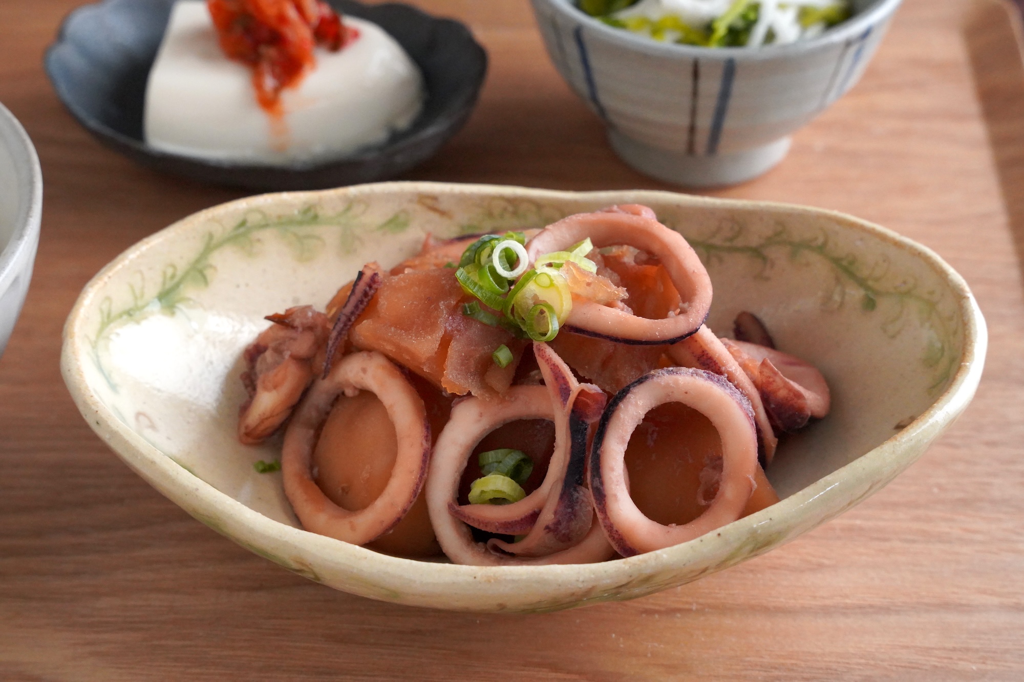 主菜はコトコト煮込んだじゃがいもにいかの旨みがじんわりと染み込み、ごはんが進む秋にぴったりの煮物です。