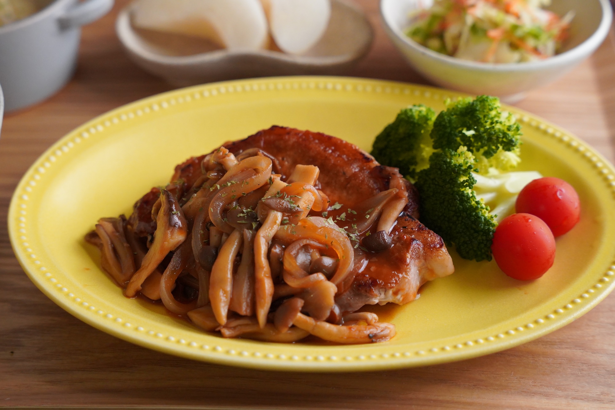 厚切りの豚肉をスーパーで見つけたので使ってみましたが、チキンソテーでももちろん◎。きのこは数種類をミックスすることで香りと旨みが増し、焼いた豚肉にかけるだけで簡単です。