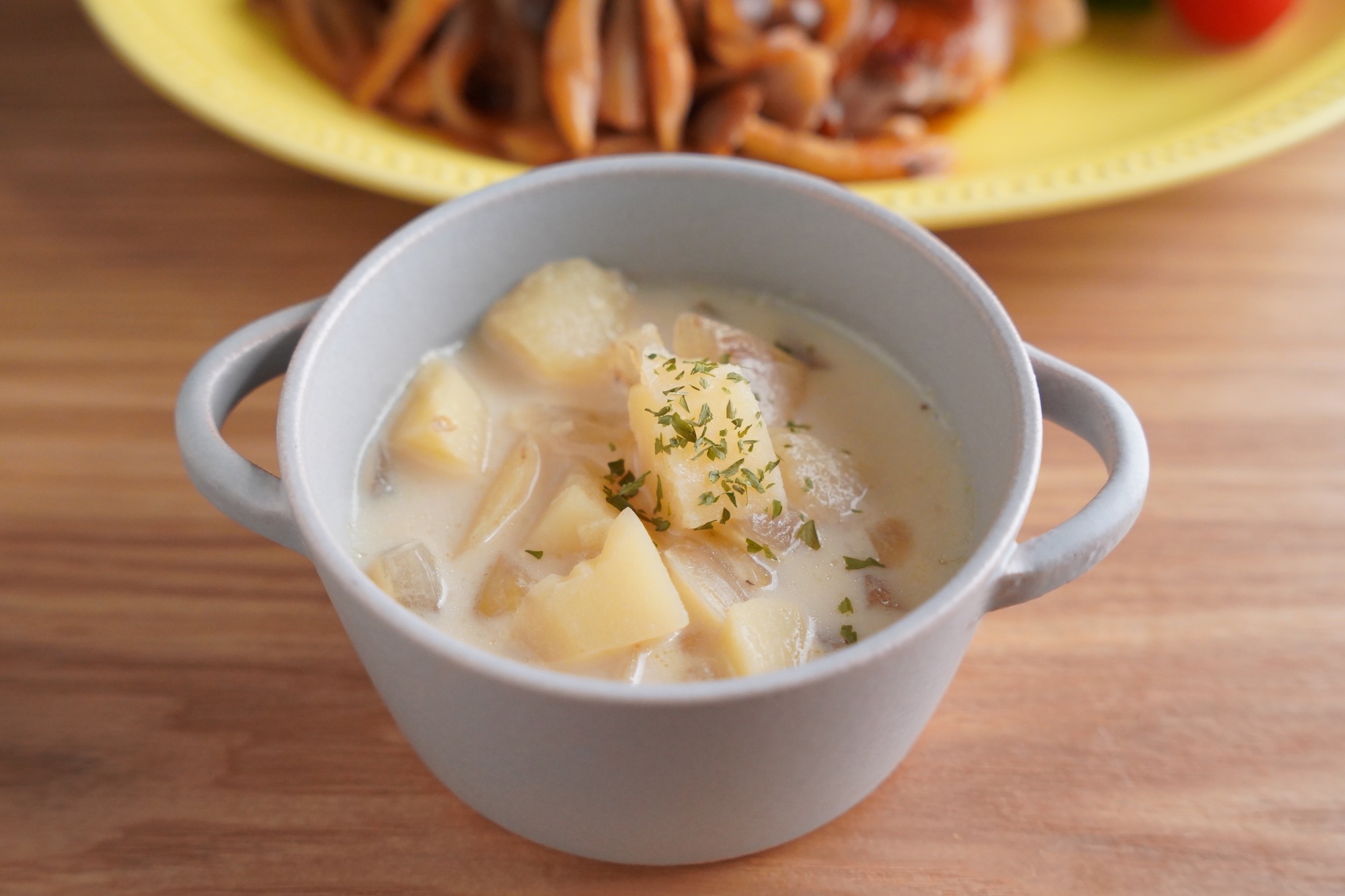 主菜に合わせて汁物も洋風に。クリームスープは、じゃがいもとたまねぎの根菜を使った優しい味わいで、ベーコンやソーセージなしでも十分に満足感があります。