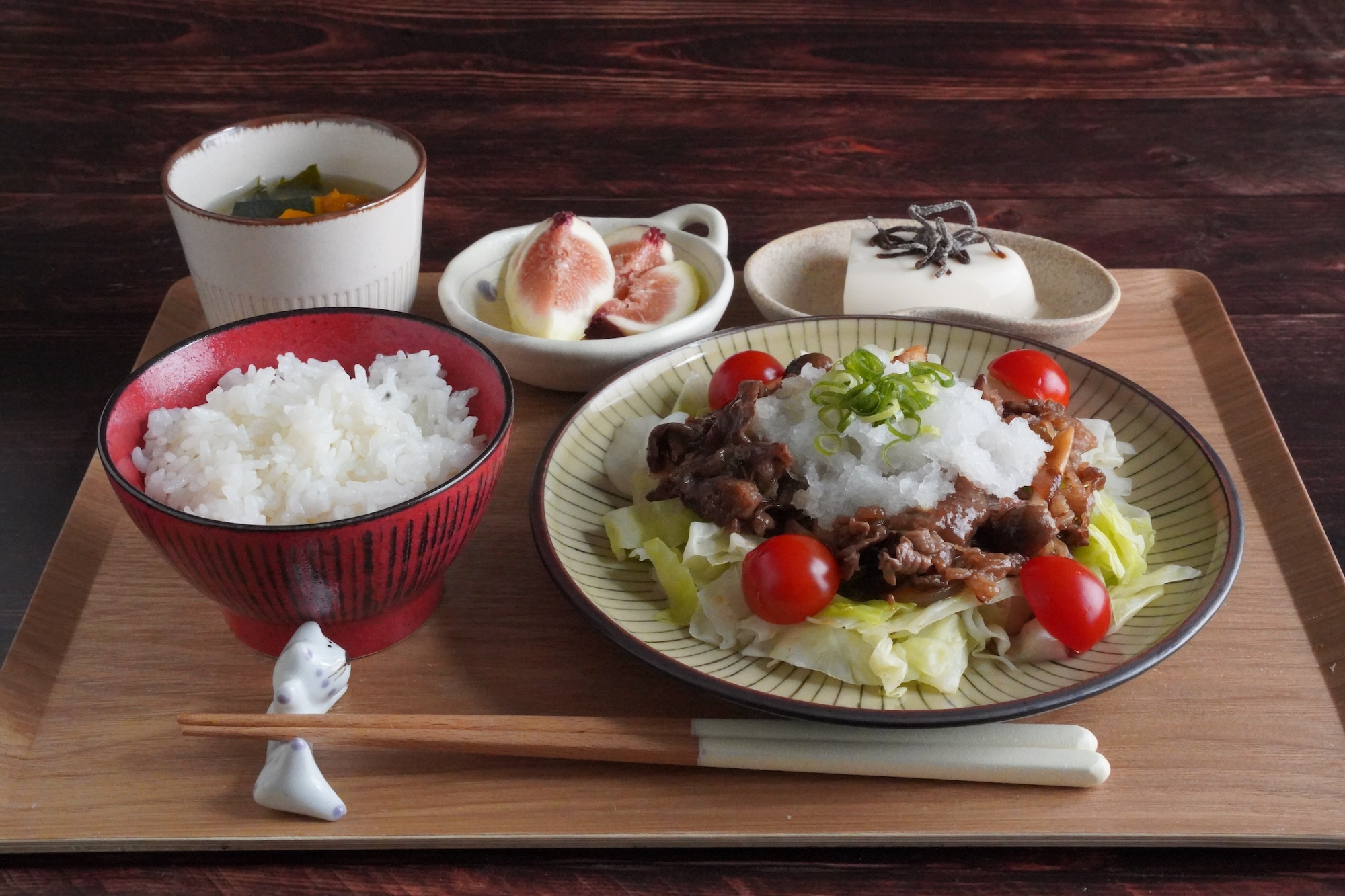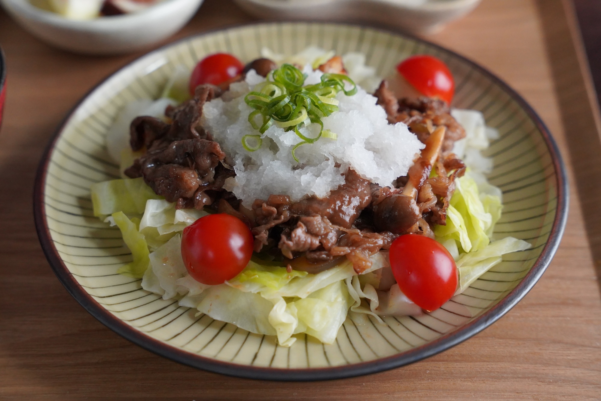 9月3週目は秋野菜を取り入れたさっぱり献立特集!2日目は茹でキャベツと大根おろしでさっぱりいただける焼き肉サラダが主菜の献立です。