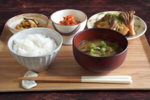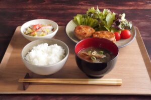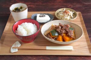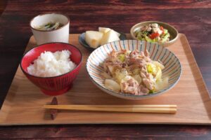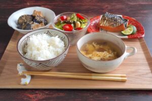 今回は、旬のさばを使った味噌煮を主菜に、さっぱり副菜と口当たりの良い卵豆腐、きのこたっぷりの汁物を添えました。
