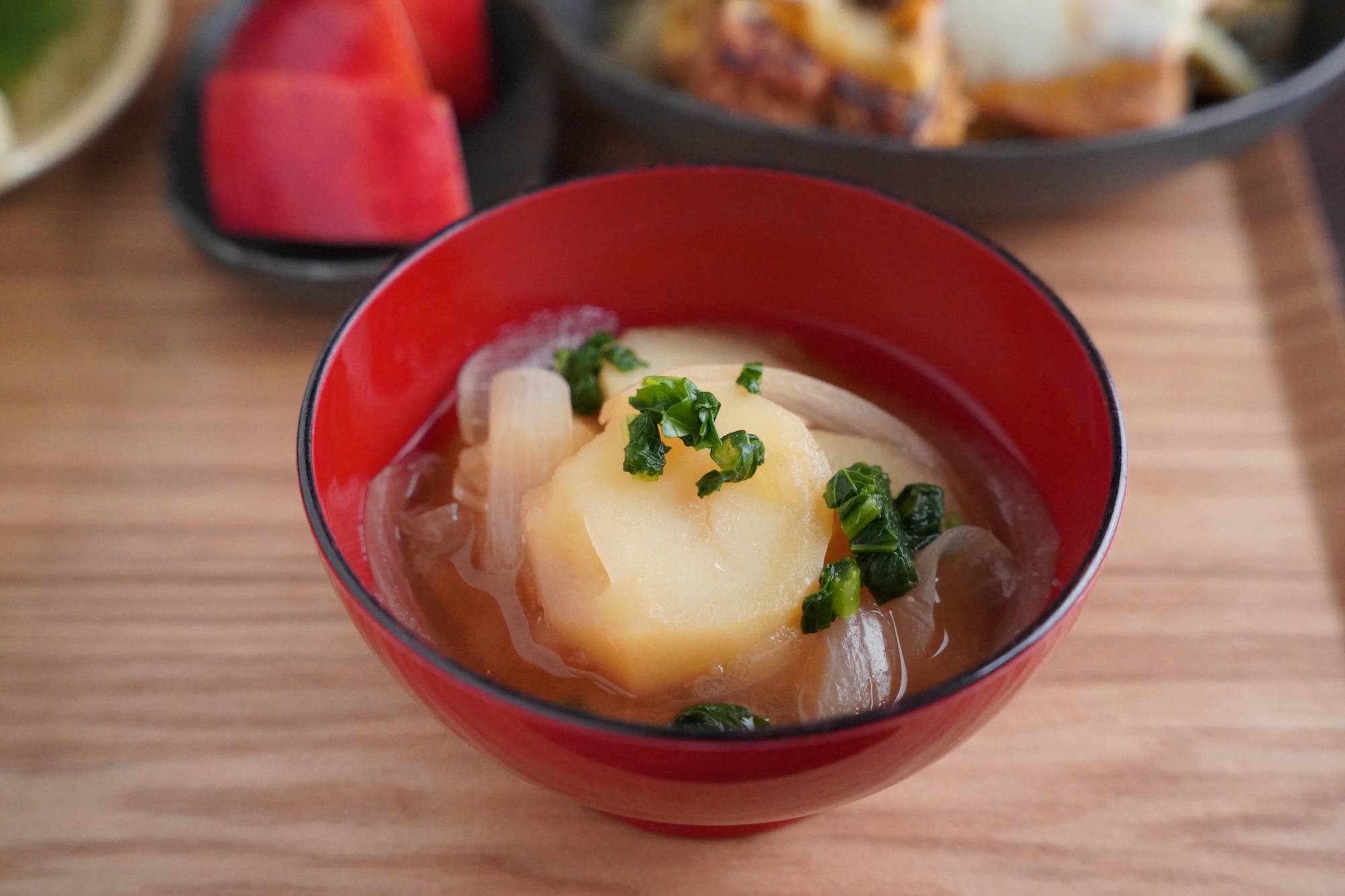ほくほくしたじゃがいもと、甘みの出るたまねぎを使った味噌汁。具材のやさしい旨みがしみわたります。