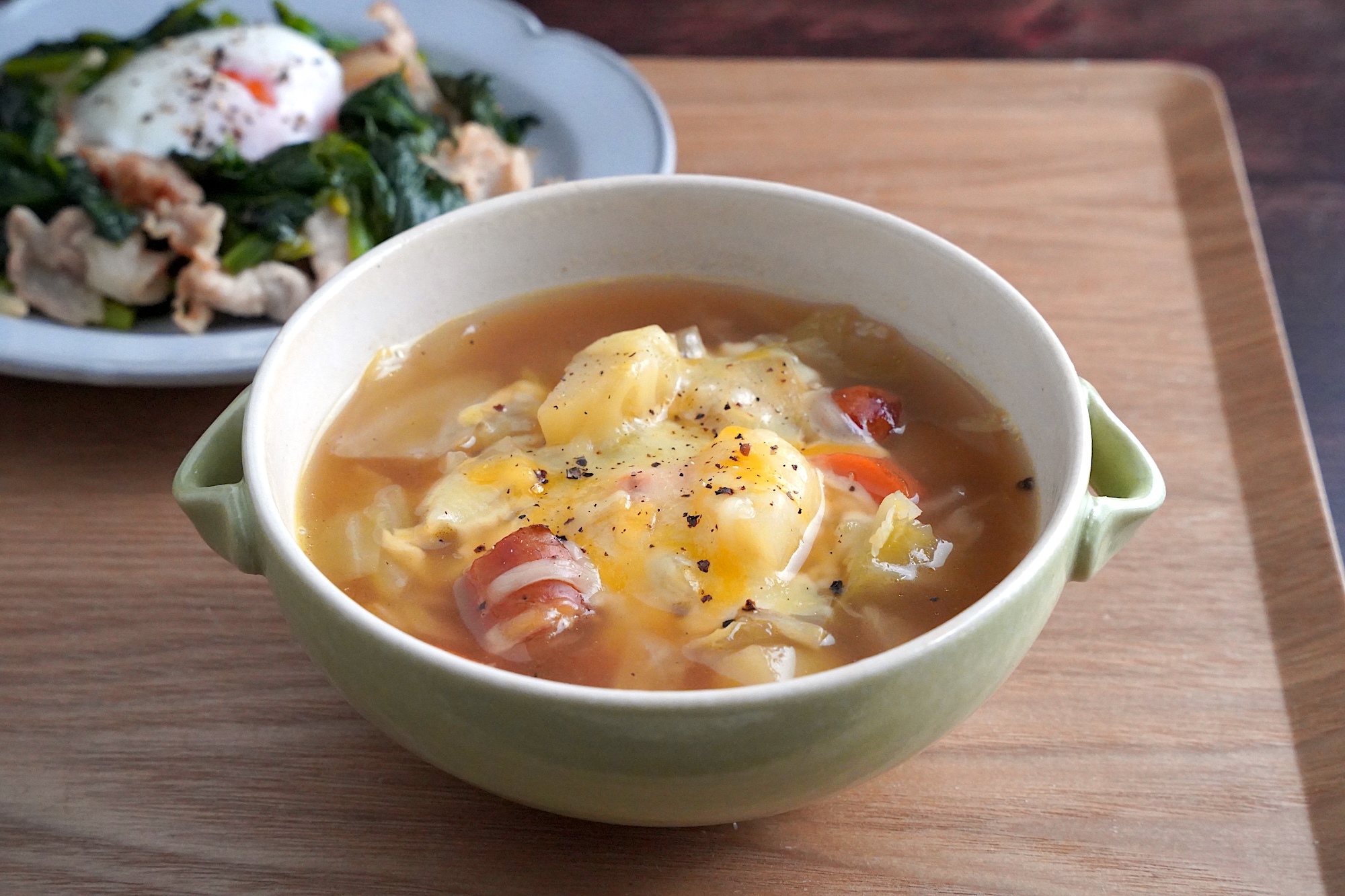 野菜がしっかり食べられる上、チーズをのせることで満足感のある一品に。主菜がガーリック風味なので、スープはやさしい味わいにして全体のバランスをとっています。