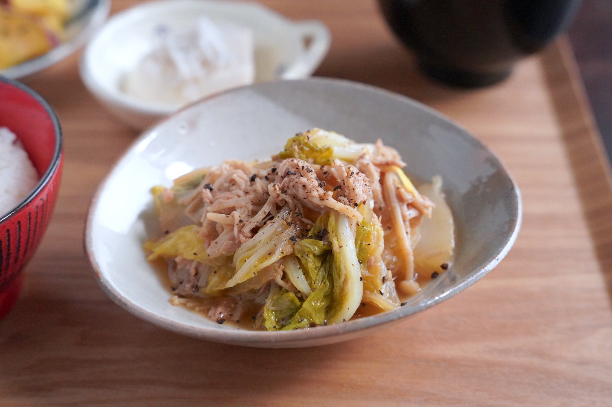 12月3週目は忙しい日に助かる簡単献立!3日目の主菜は入れて蒸すだけの白菜とツナの蒸し煮です。