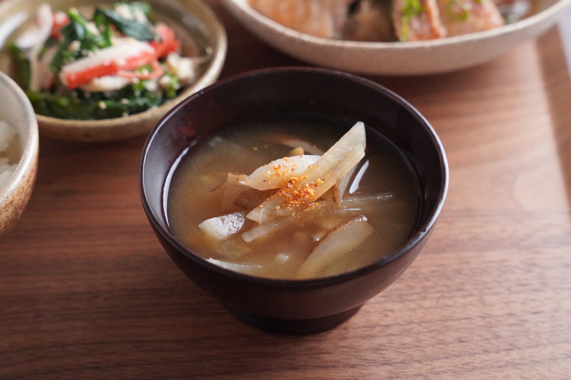2日目の献立を作る際にまとめて切っておいた大根とごぼうを味噌汁の具へ!やさしい甘みが広がる、シンプルな味噌汁に仕上がりました。