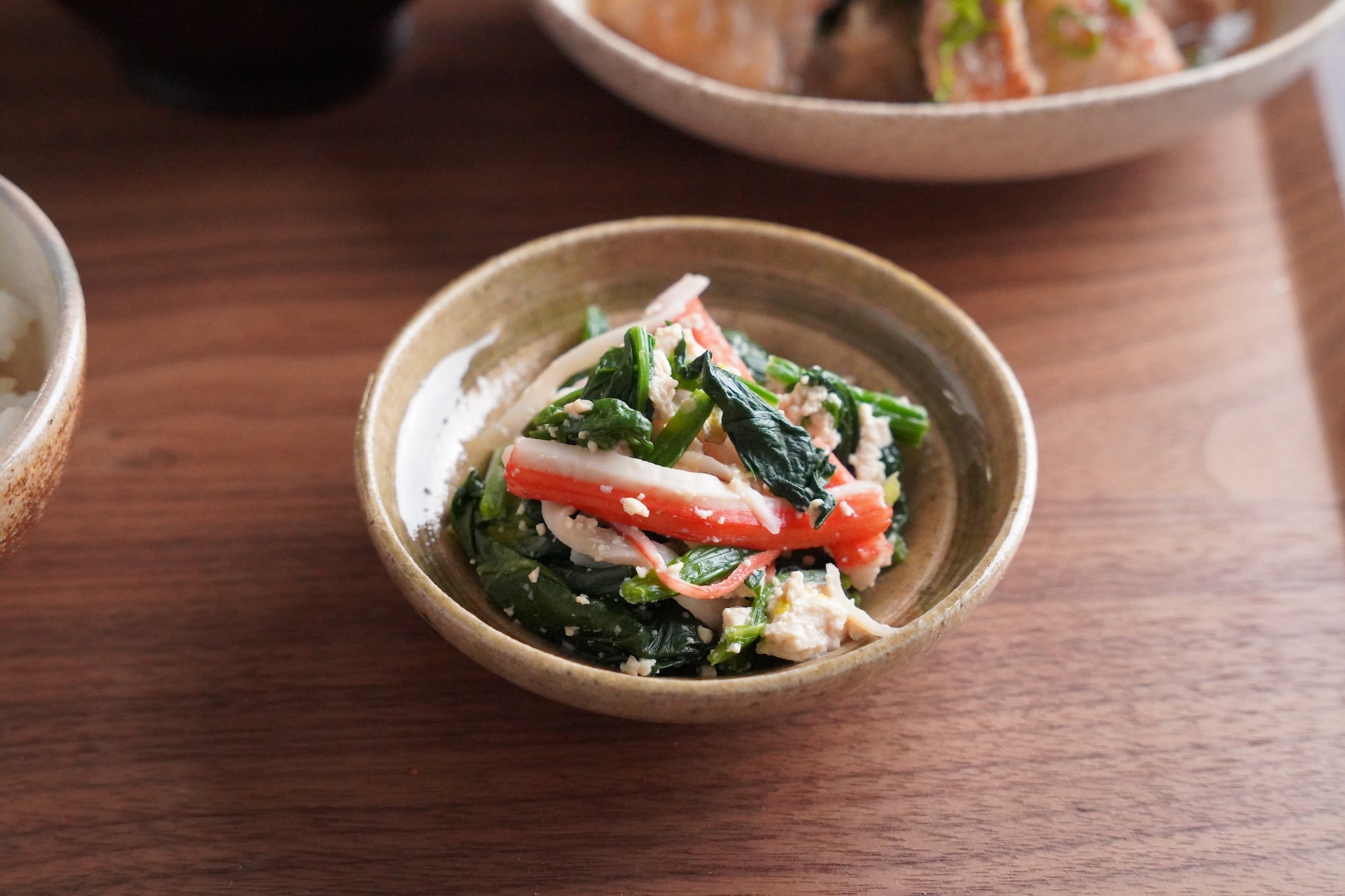 ほうれん草を豆腐で和えた、やさしい味わいの副菜。コクはありつつも後味は軽く、熱々のみぞれ煮にもよくあいます。