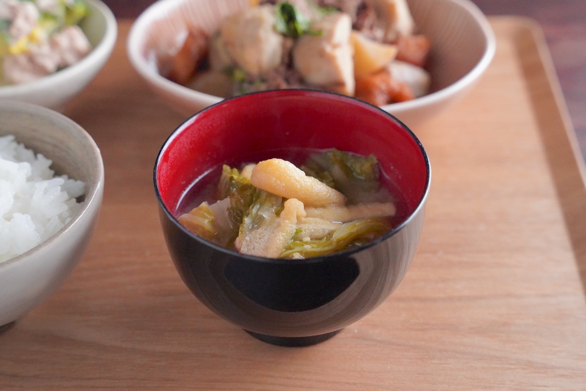 1日目の白菜を使い回したやさしい味わいの味噌汁。薄揚げの油でシンプルながら満足感があります。