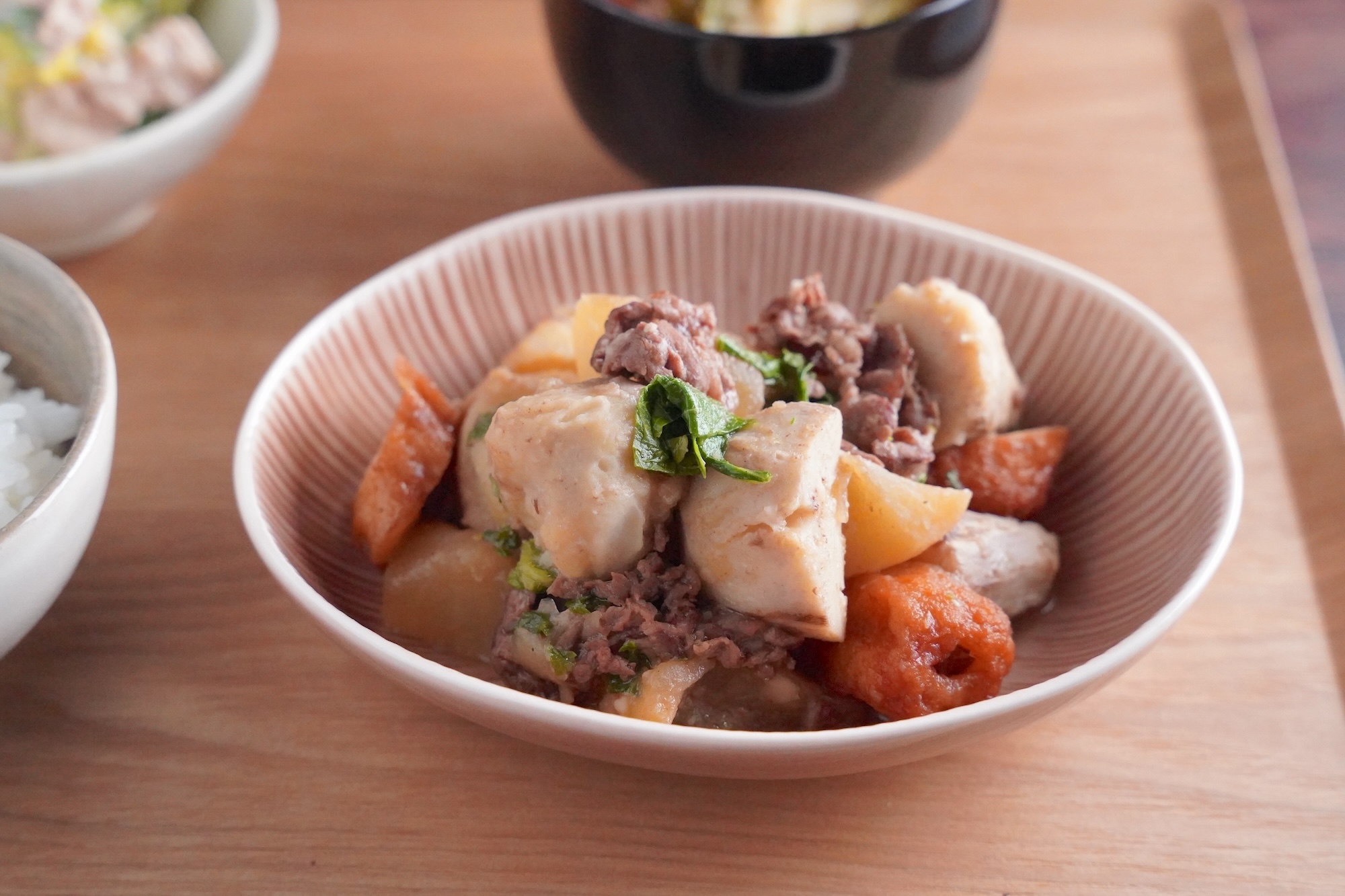 煮物と和え物、汁物を組み合わせて、体を温めながら無理なく野菜をとれる晩ごはんですよ。