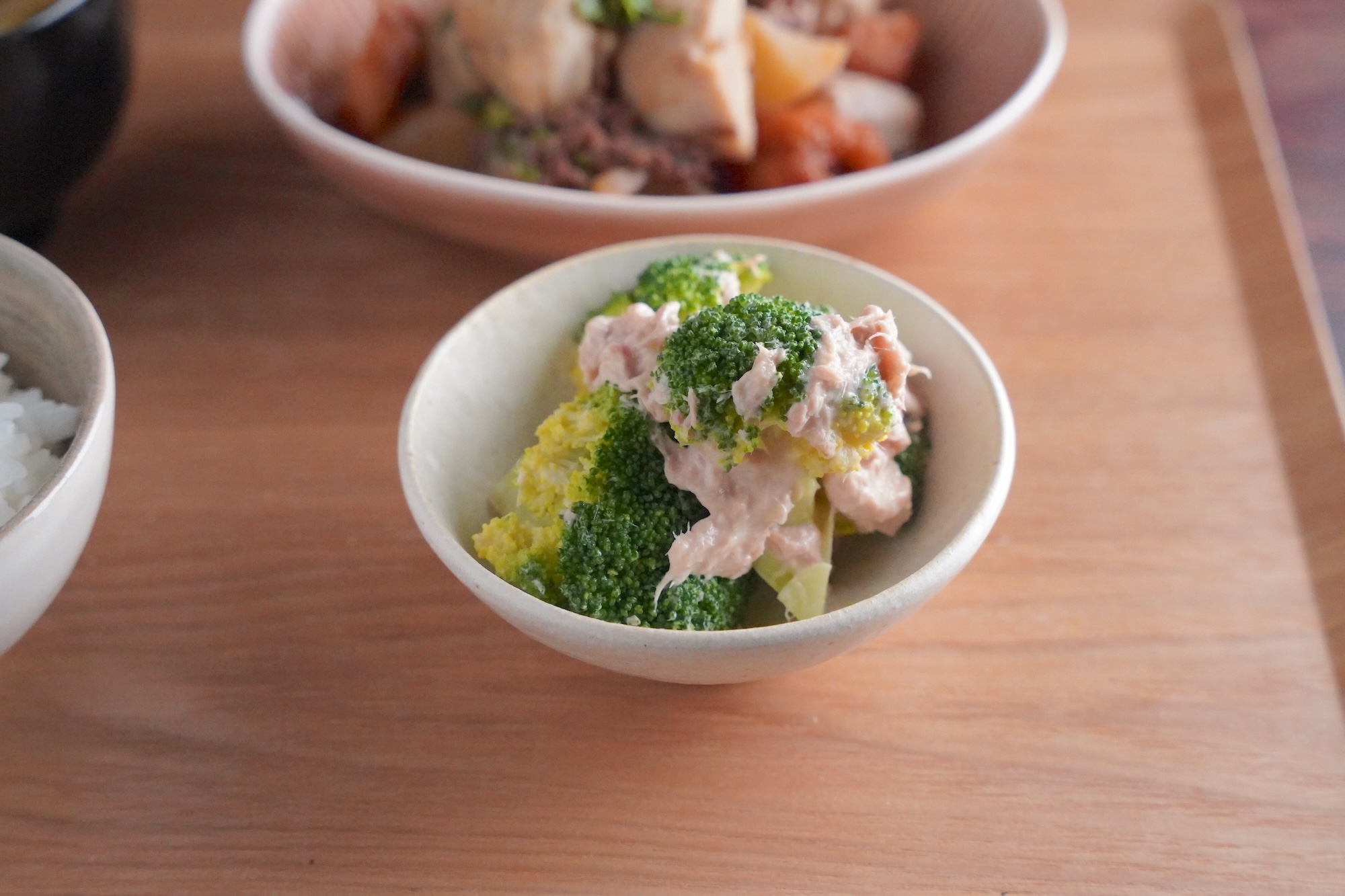 ブロッコリーをツナマヨで和えた手軽な副菜。甘辛い煮物献立に爽やかな酸味とコクをプラスしてくれます。