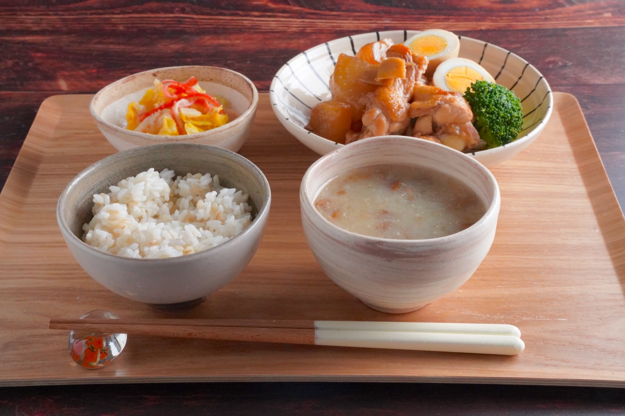 2日目は、大根と手羽元のうま煮が主菜のじんわり温まる和食です。味の染み込んだアツアツの大根は寒い日に嬉しいごちそうです^ ^