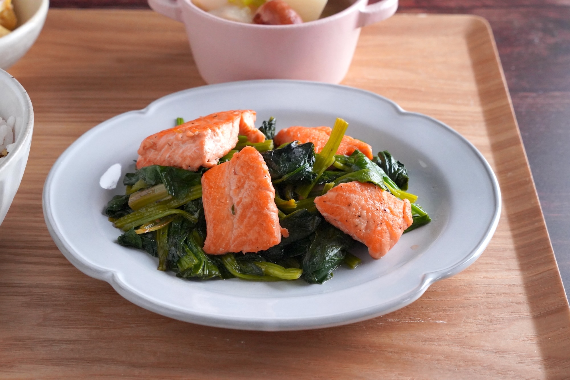 鮭とほうれん草のバターポン酢炒めは、旬のほうれん草をたっぷり食べられる主菜です。