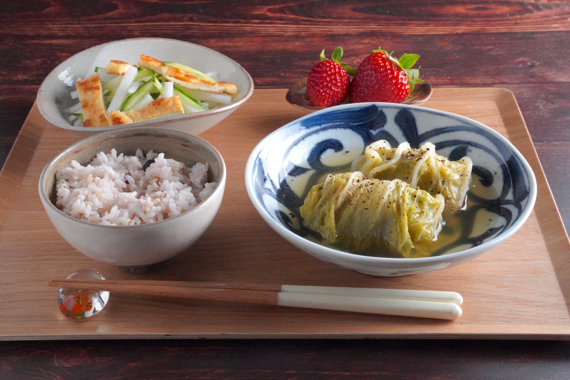 ロール白菜のやわらかい食感に合わせて、副菜はパリッと焼いた薄揚げとシャキシャキの大根を合わせたサラダに。