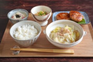 3月1週目のテーマは、脱マンネリの晩ごはん。1日目は白菜のアレンジメニューで、キャベツではなく白菜で作るロール白菜が主役の献立です。