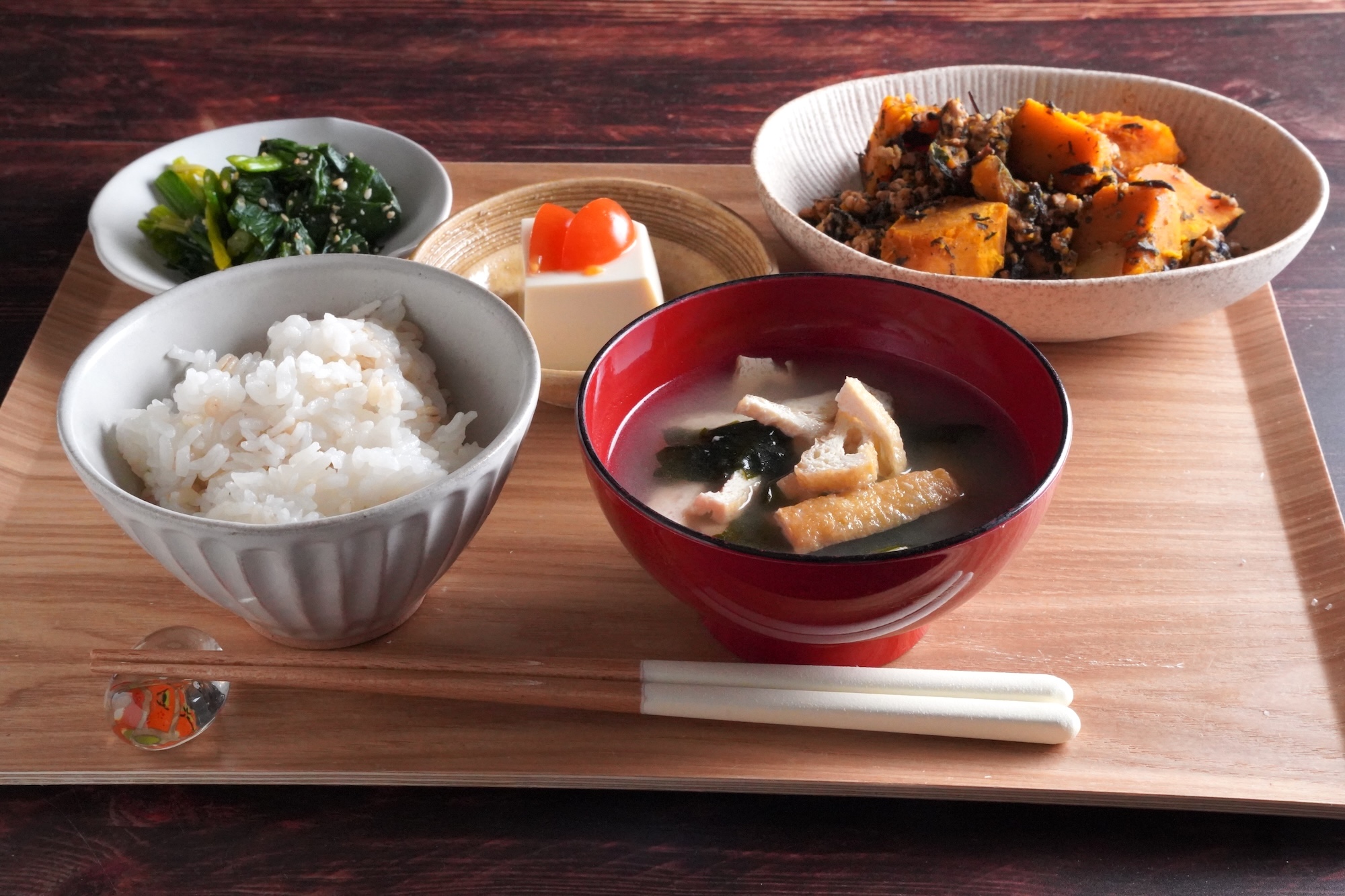 汁物は定番の薄揚げとわかめの味噌汁。