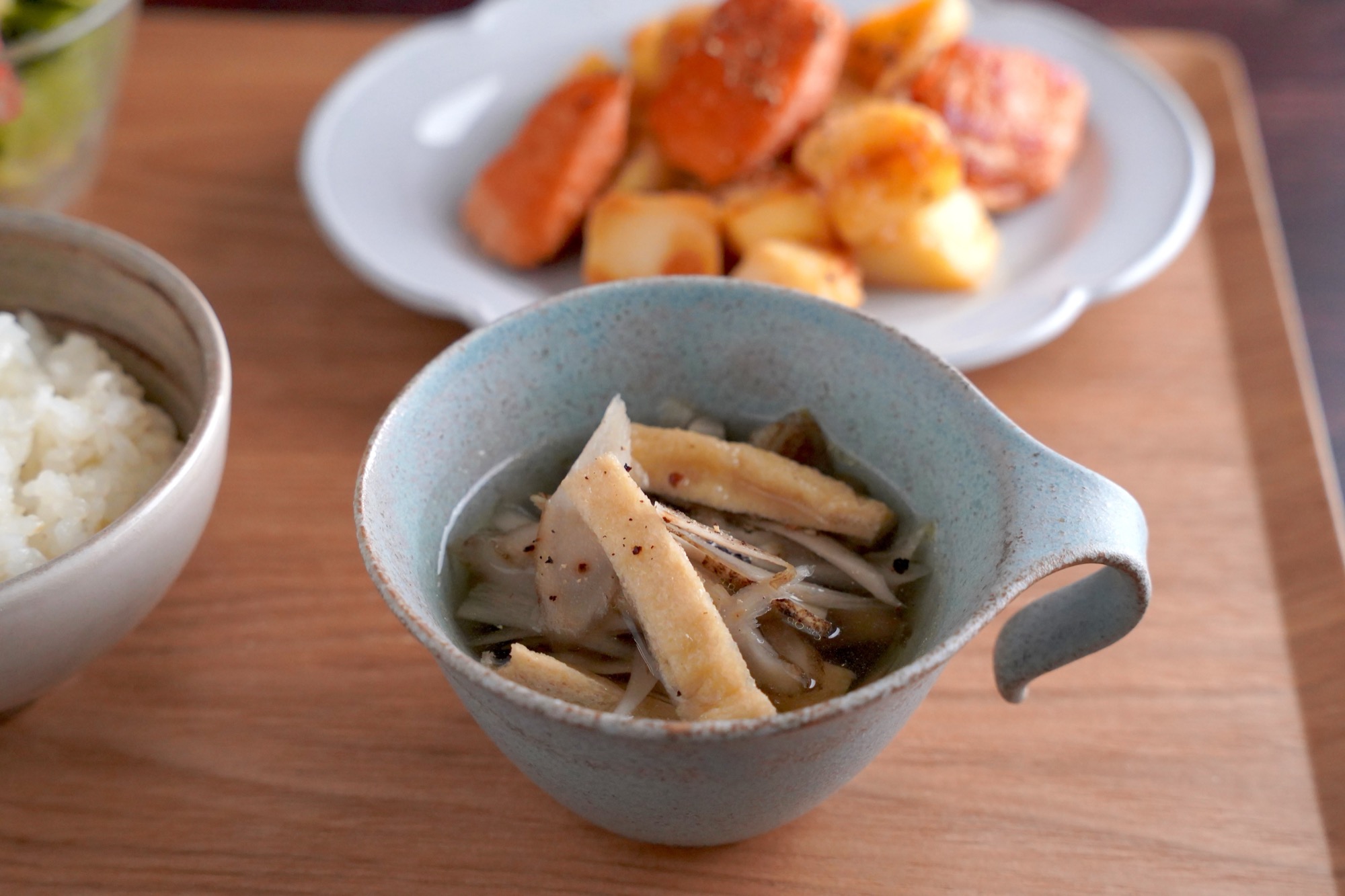 ささがきにした春ごぼうの香りが広がり、薄揚げのコクがプラスされた優しい味わい。シンプルなスープで献立全体のバランスを整えてくれます。