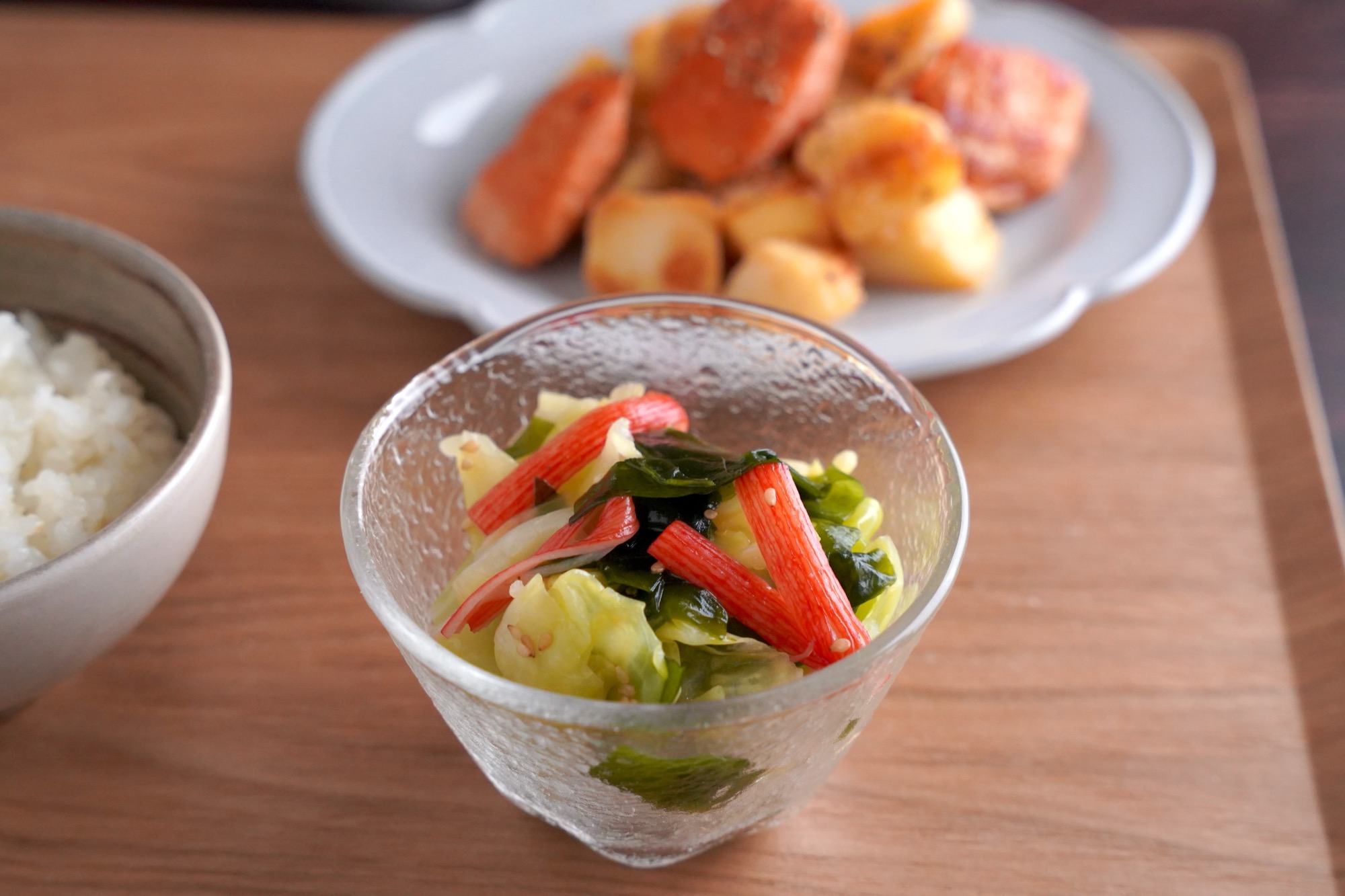 - ボウルにキャベツ、わかめ、ほぐしたカニカマを入れる